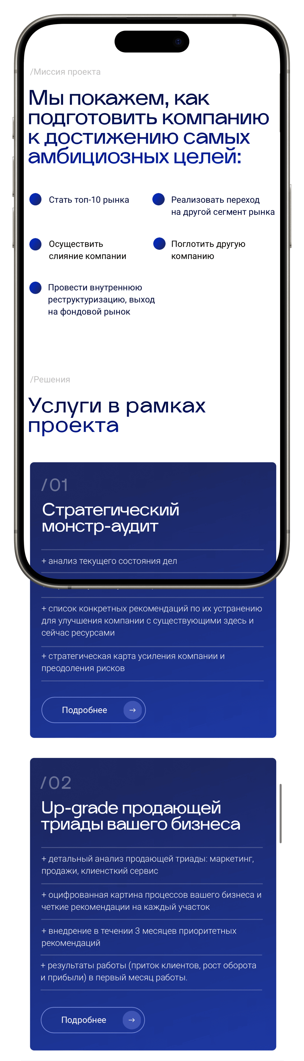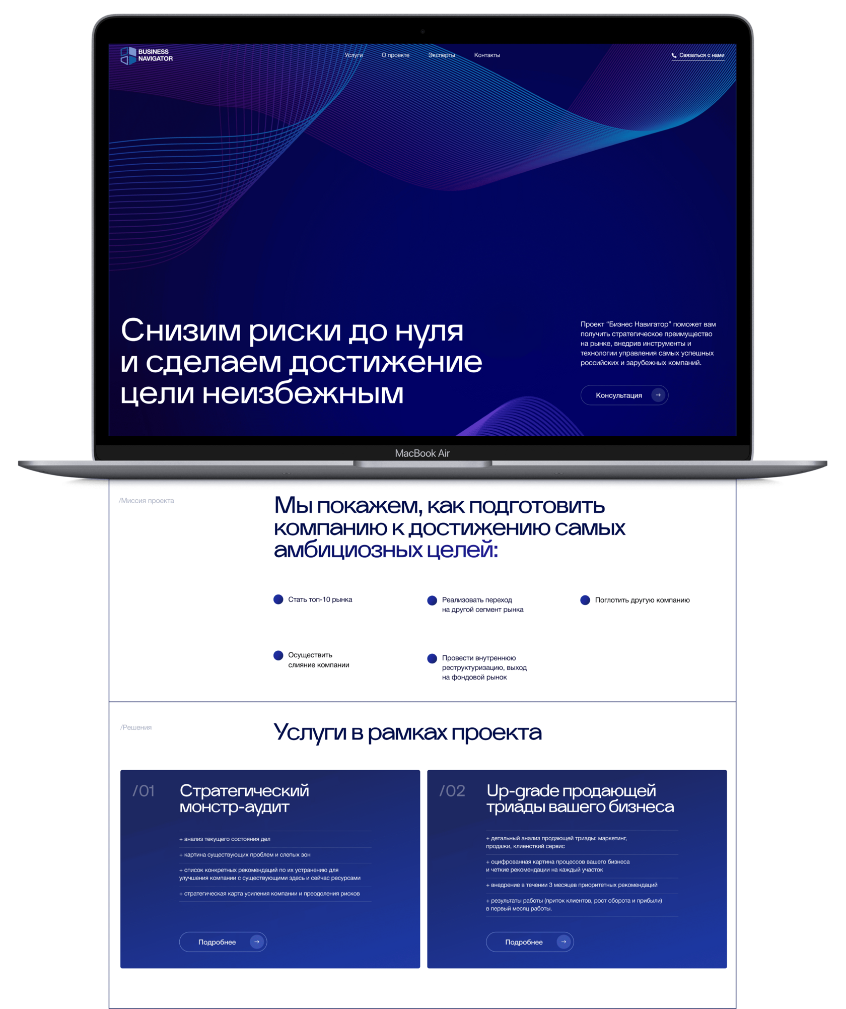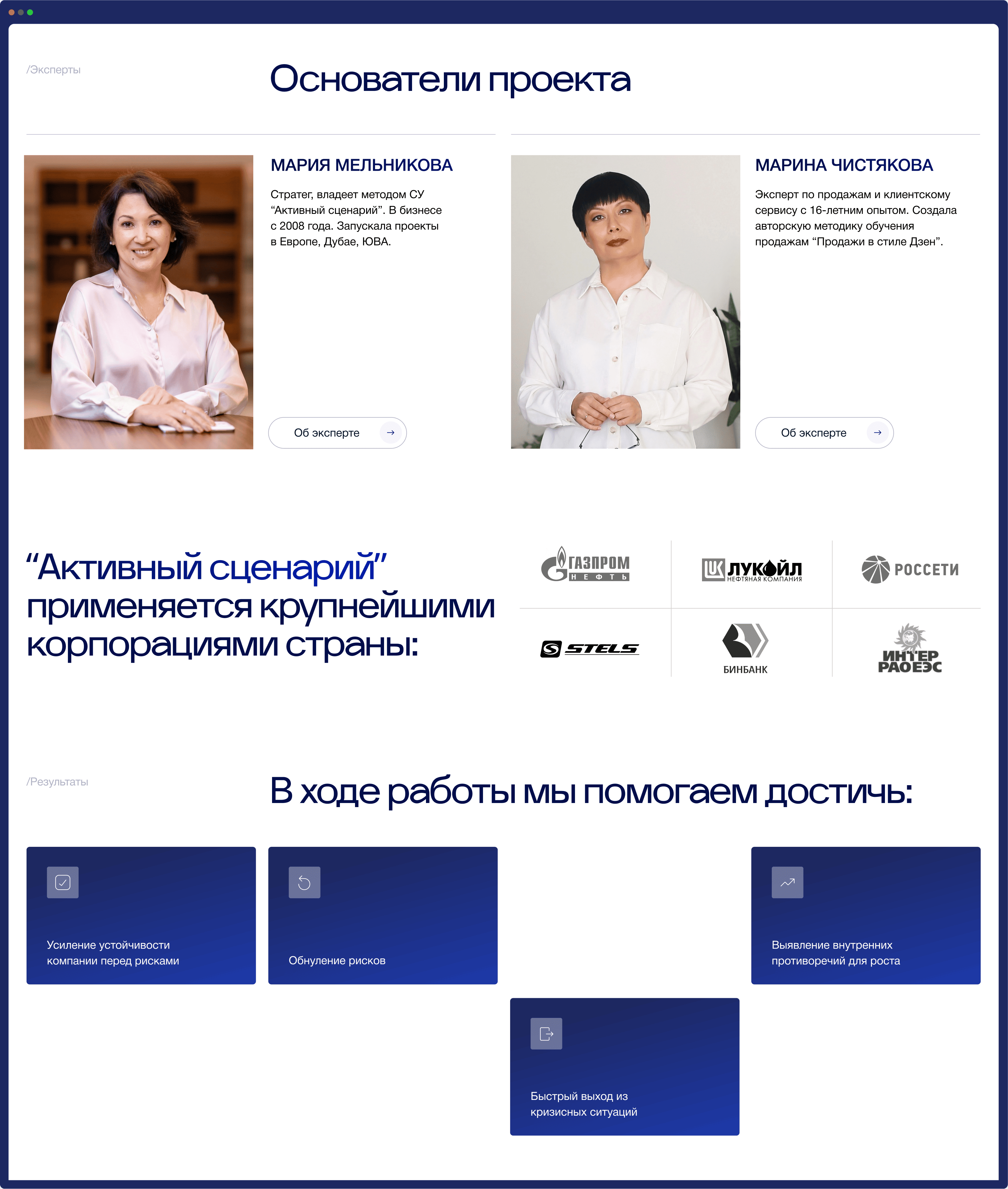 Весь контент и структура сайта были созданы исключительно под запросы этого сегмента: были выделены проблемы и цели клиентов. Важный момент — нецелевые сегменты должны “отсеиваться” в процессе изучения сайта. Так как проект является уникальной разработкой авторов-практиков, прямых конкурентов нет.
